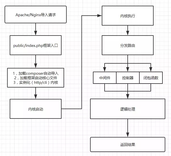 理论上,生命周期主要有这么些阶段,但其中,开发者大多数只需关注路由、中间件、控制器、闭包函数、逻辑处理等几步 当然,每一步的内部,还是会有更多细化的执行流程,在这里,一般不深入研究框架或改造框架,很少会细化研究,但研究底层,依旧是学习的好选择。